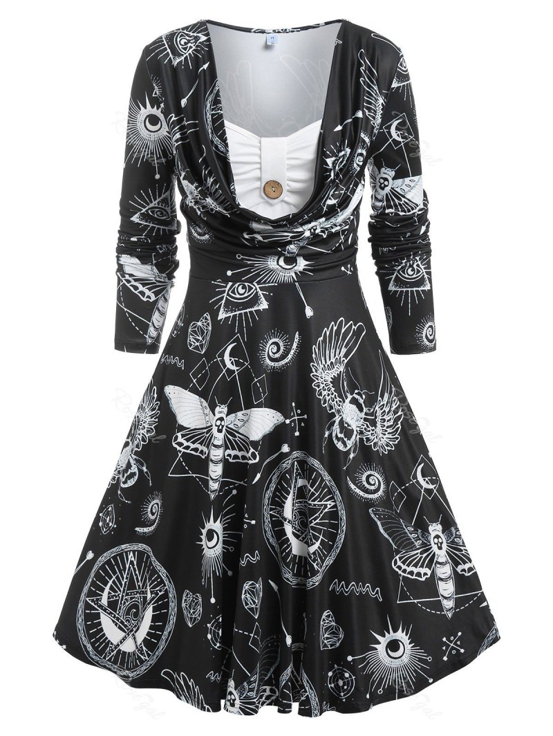 Sun Moon Star Dragonfly Print Draped Faux Twinset Dress