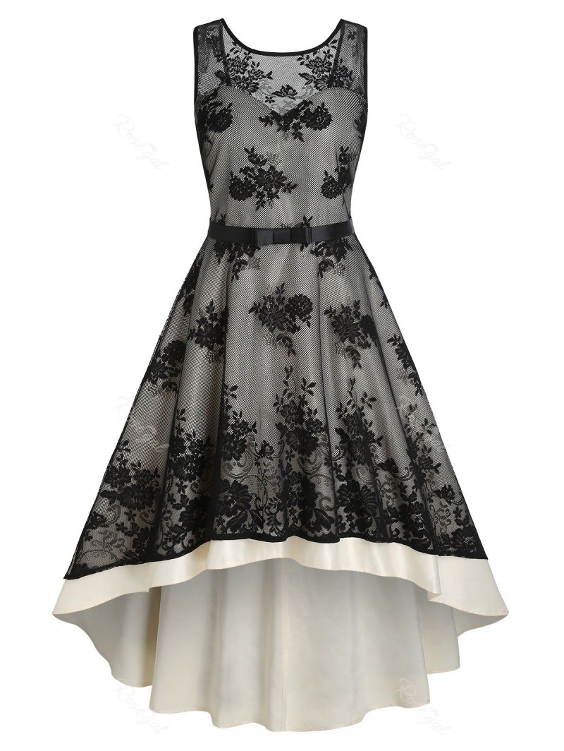 Flower Patterned Lace Overlay Belted Dip Hem Dress